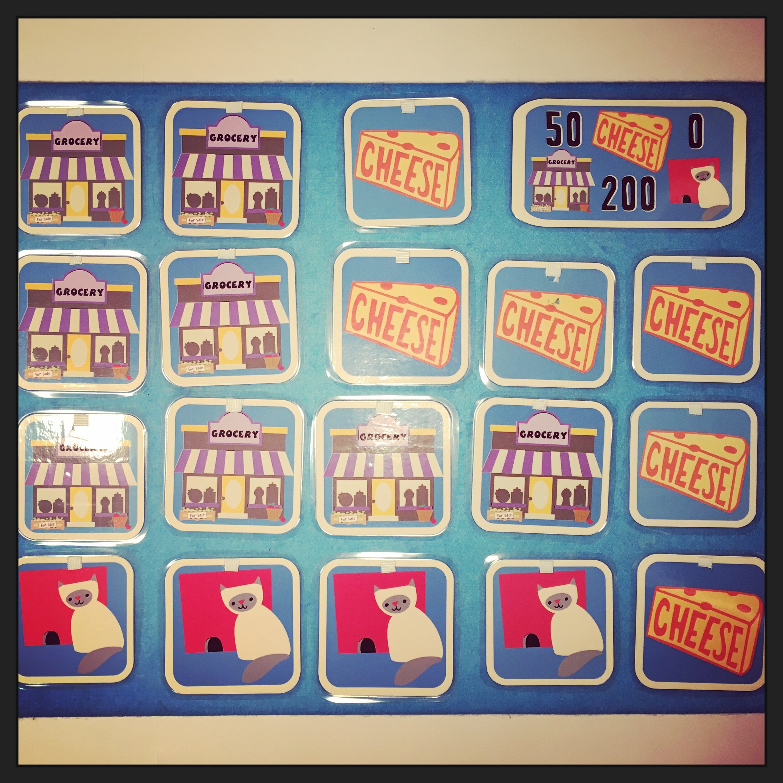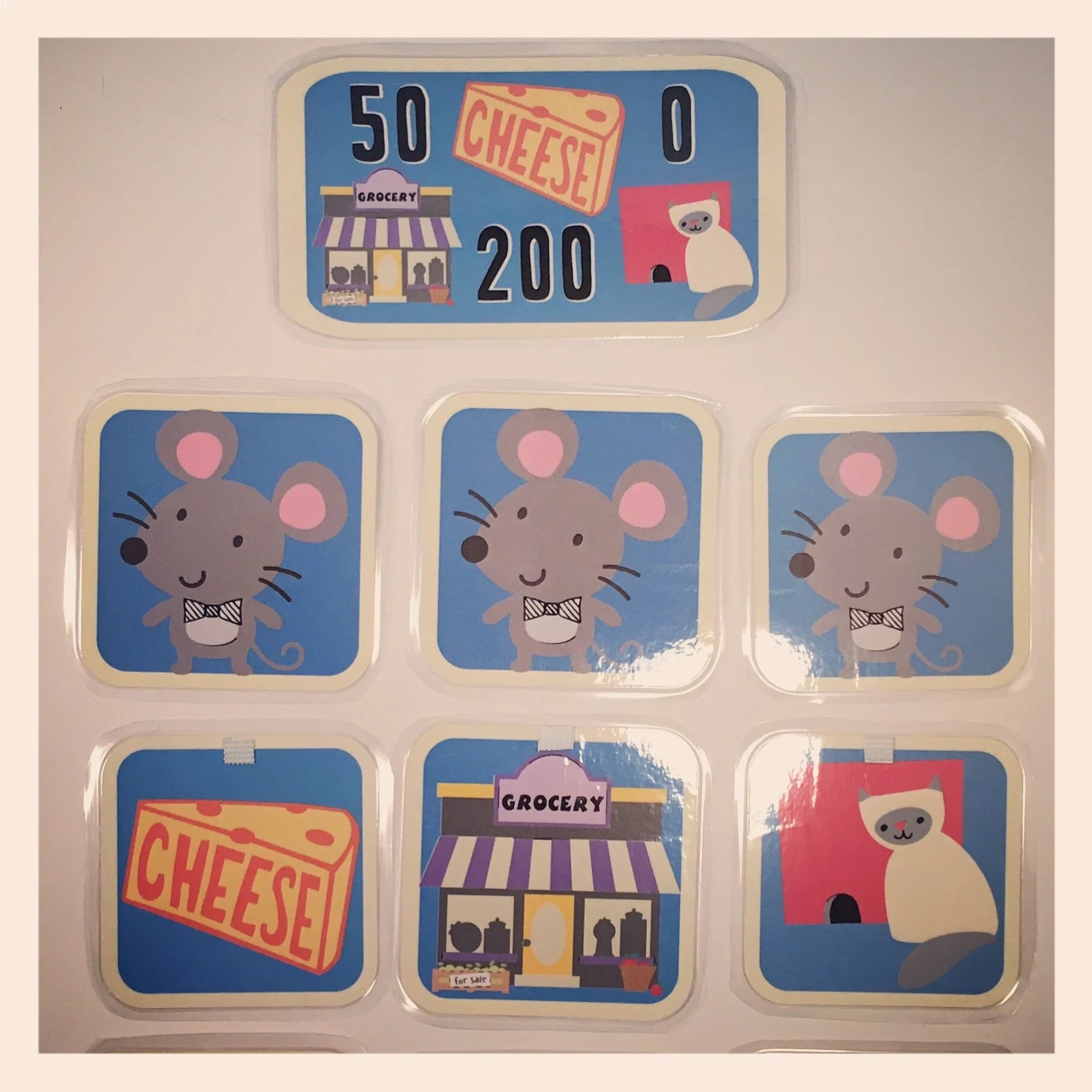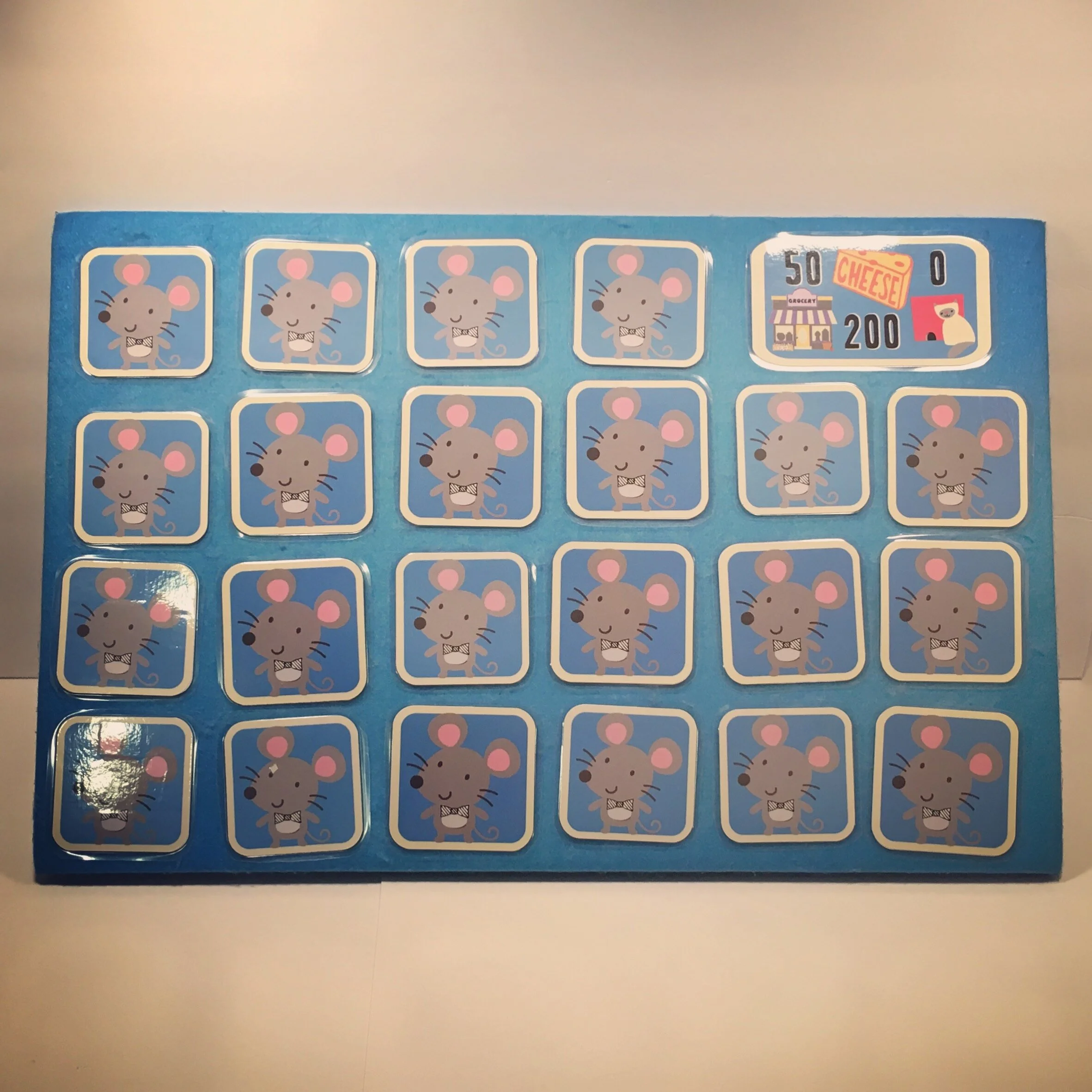 Make 22 squares with a mouse on the front. On the backs, make 10 with cheese, 8 with a grocery store, and 4 with a cat. Make a score card with each picture from the backs of the game pieces. The cheese is 50 points, the store is 200, and the cat is 0. Laminate or use contact paper to extend the life of the game. (If there is a Mardel's bookstore or a teacher supply store in your area they usually offer very good prices on lamination.) Add a small amount of self-adhesive velcro to the backs of the pieces. Attach to the board and you are ready to go.