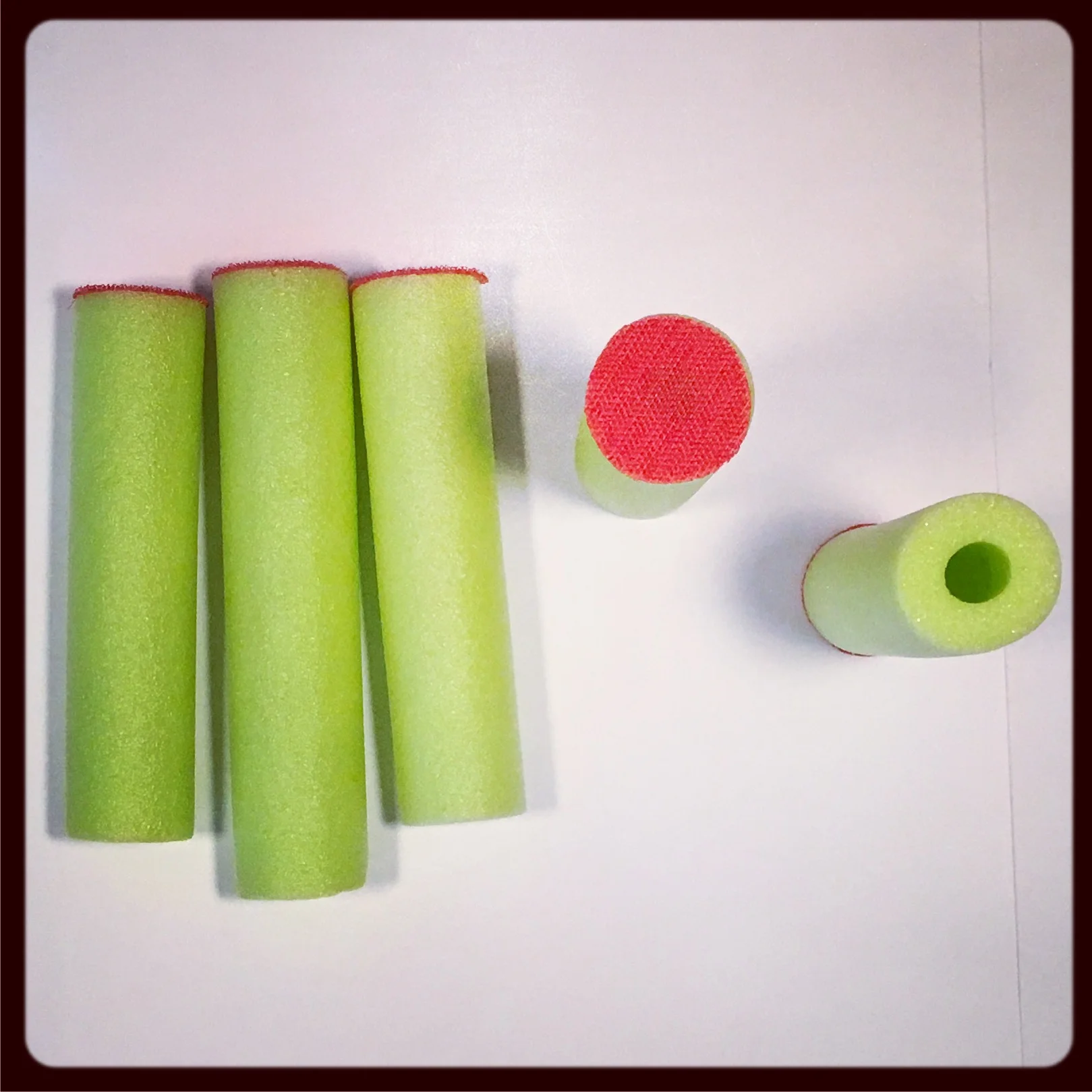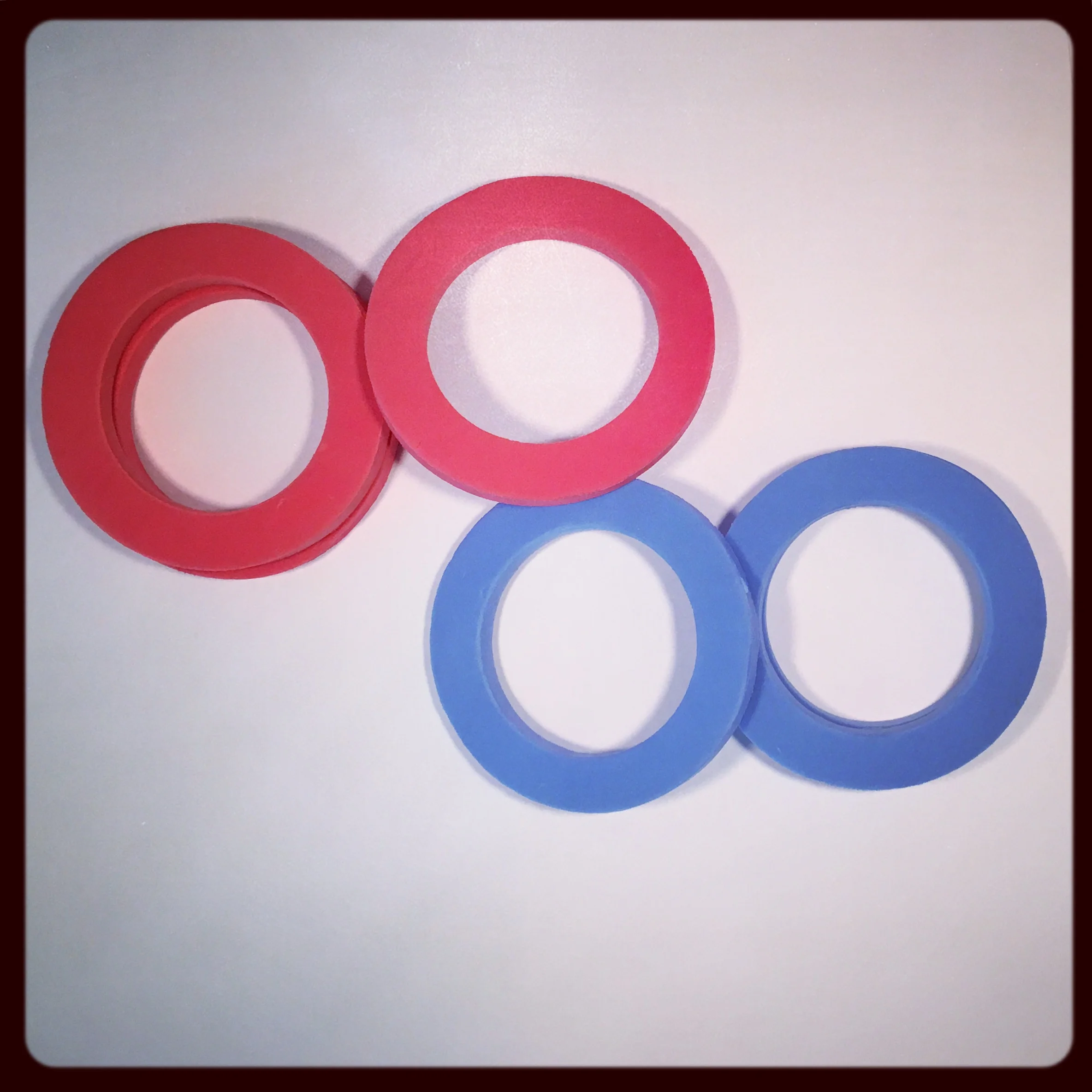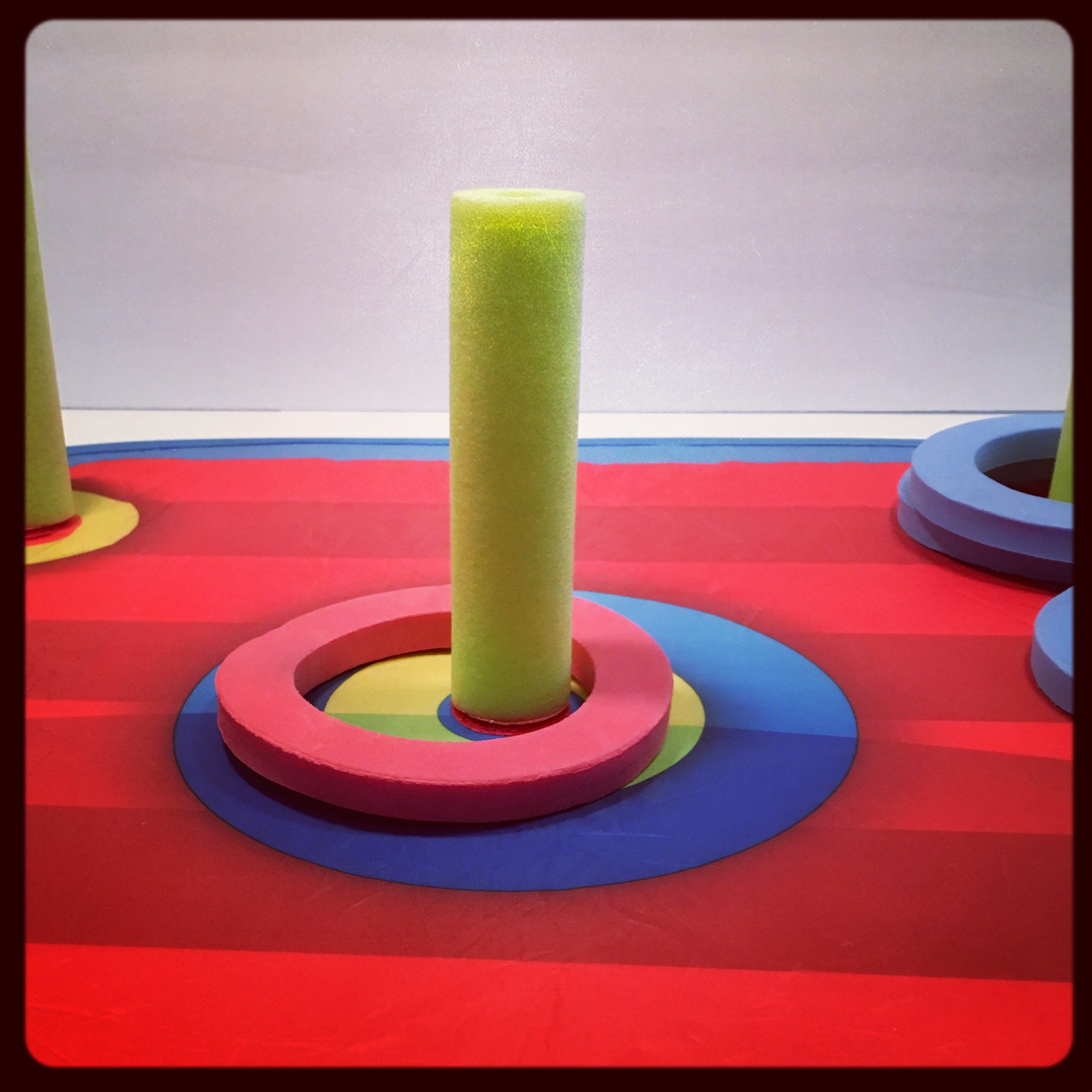 The rings (3 of each color) are made of foam, the lightweight aspect adds a bit of a challenge trying to get the rings over the posts (made of pool-noodle material). The posts attach with velcro, which sometimes comes loose from the foam noodles and sticks to the opposite velcro piece. (Some hot glue could probably fix that, although it doesn't bother me so far, so I just let it be.)