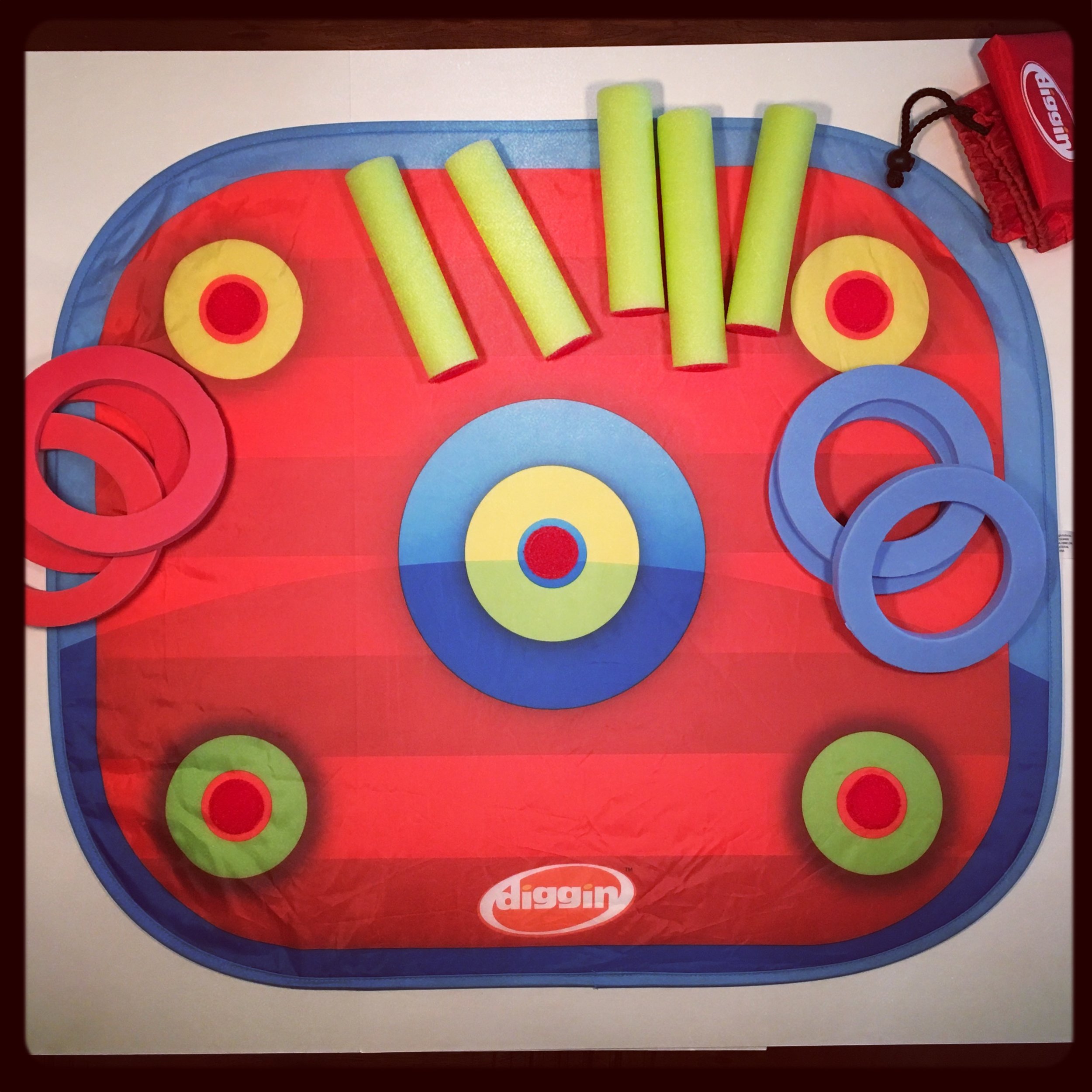 The gameplay is pretty straightforward. When the child answers the review question correctly, they come forward to play the game. They get 3 chances to toss their team colored rings onto the posts. The center ring is worth more than the front posts, and the back posts are worth more than the previous posts. For younger children, have them stand pretty close to the game when tossing the rings. I suggest you experiment with the distance a child must stand when playing, because it is a little difficult due to the lightweight foam.